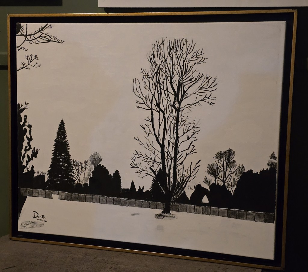 As it is always tough to close shut, I gave the door to the balcony a bit of encouragement by heaving my right shoulder into it. On turning away from the door, I noticed one of George’s gifts to me “Woman” was titled off its hook on the cement wall where moments before taking to the balcony it had sat perfectly aligned. Yet another sign indeed. Finally, today at work, as I kept checking the folder which bore all George’s email correspondences, then did a Google search for ‘George Hawken Obituary’ alas there was confirmation. George had died the day before I had sent him my final email; it was one in which I offered to buy a copy of an illustration which he had done for an anthology of emerging Canadian authors.