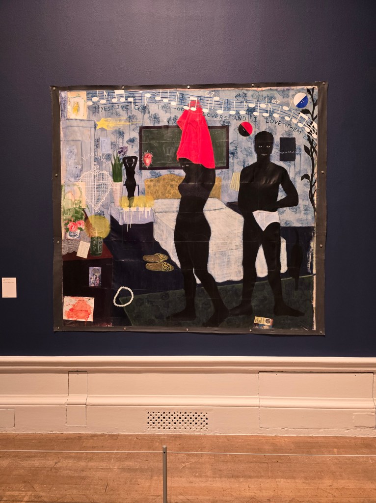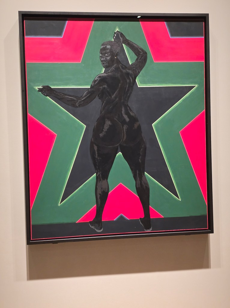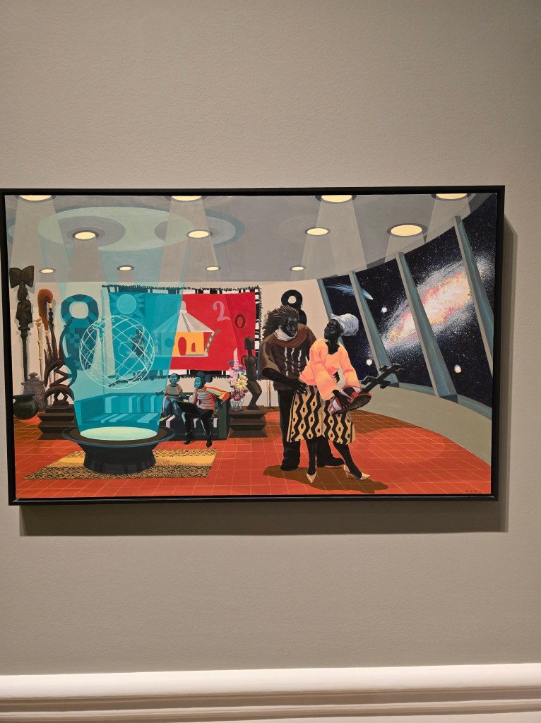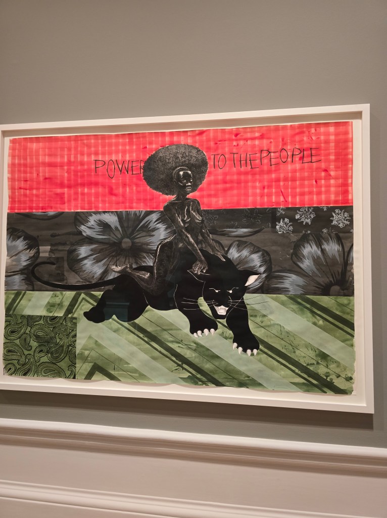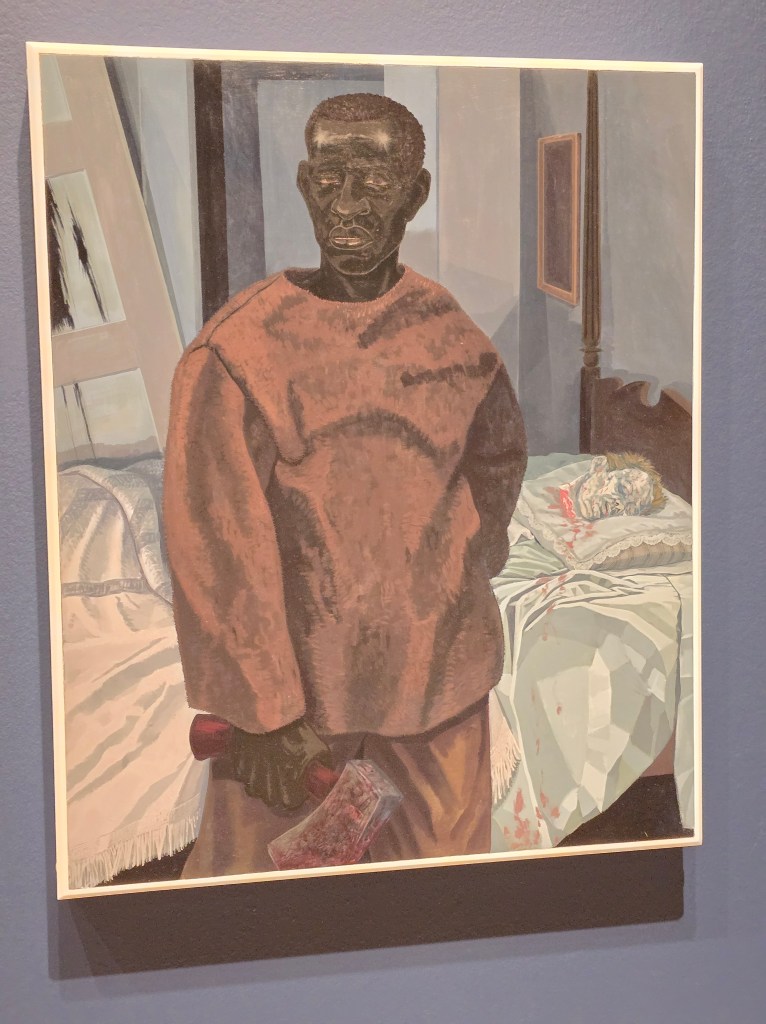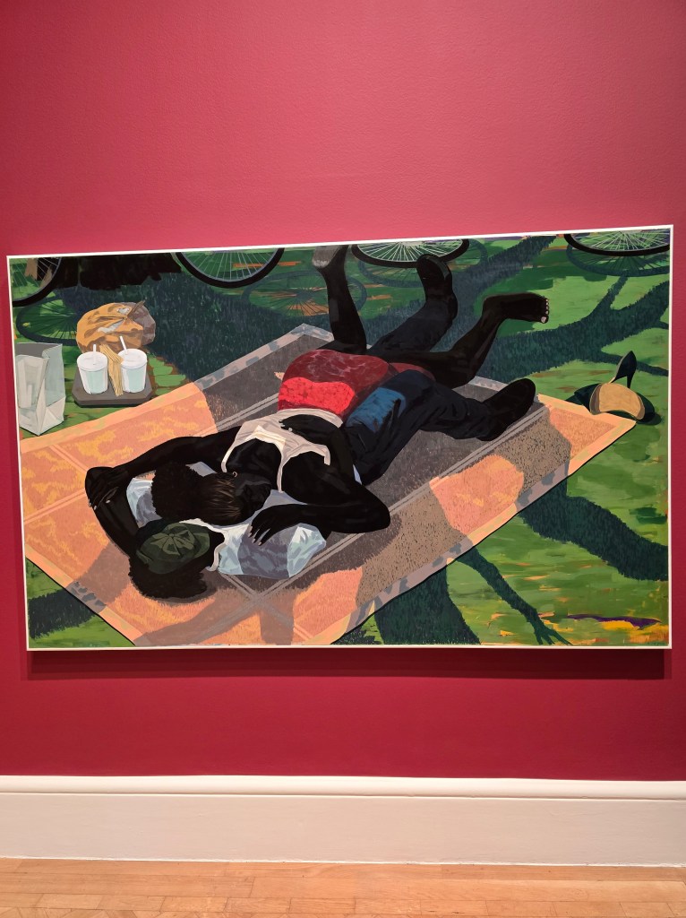 What I truly love about this art exhibition of African American Kerry James Marshall is the artist’s attack, which is unapologetic about blackness. Marshall seems intent on stabbing the middle finger at the gross colorism within Black culture and in particular within Black America. The jaundiced self-loathing colorism of Blacks immediately breeding to ‘improve’ the race on become wealthy and successful with others who have proven our most ardent enemy, is unmistakably alluded to in Marshall’s works. The allure and deception of light-skinned offspring as though somehow they in their outréness make anti-Black racism go away or somehow they will escape their Blackness, the artist addresses head on with his choice of portraying Blacks splendidly, unmistakably richly melanated. The arch obsession with being biracial, mixed race and anything but Black speak to the intense anti-Black animus that stifles colorism. Blackness, or is it massa, is a shame that must be eradicated. Humans, truth be told, are seven parts decidedly absurd.