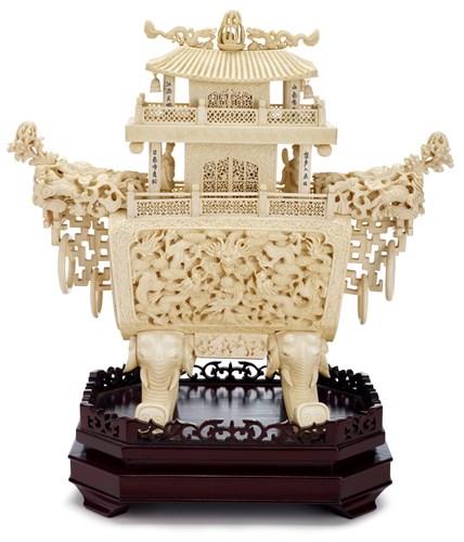 Before you went down the steps, into this other area, there were all these beautiful, beautiful organic works that are quite common in the Orient. For example there were many objets d’art.These were objets d’art which were beautiful temples and totems. They were all made from the ivory of elephants’ tusks. It was all beautifully detailed and in miniature – all the miniature designs were made of ivory.That was the sort of stuff. This particular objet d’art was large. It was square-shaped so that it wasn’t like an elephant’s tusk. More like an obelisk, if you like, it was.They were more so little temples. They were shrines and Greek temples if you like. What was truly fascinating was how incredibly detailed they were though scaled down versions of the real architectural gems.