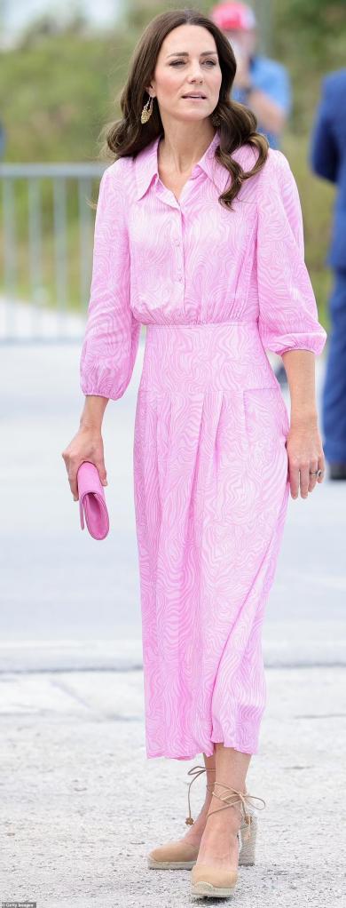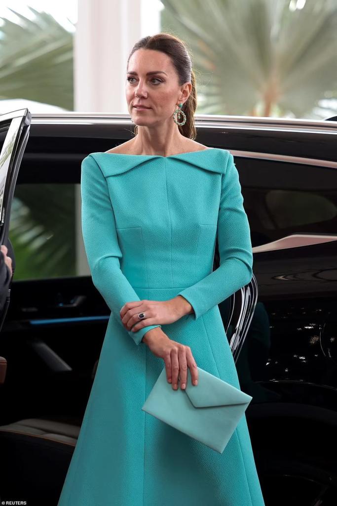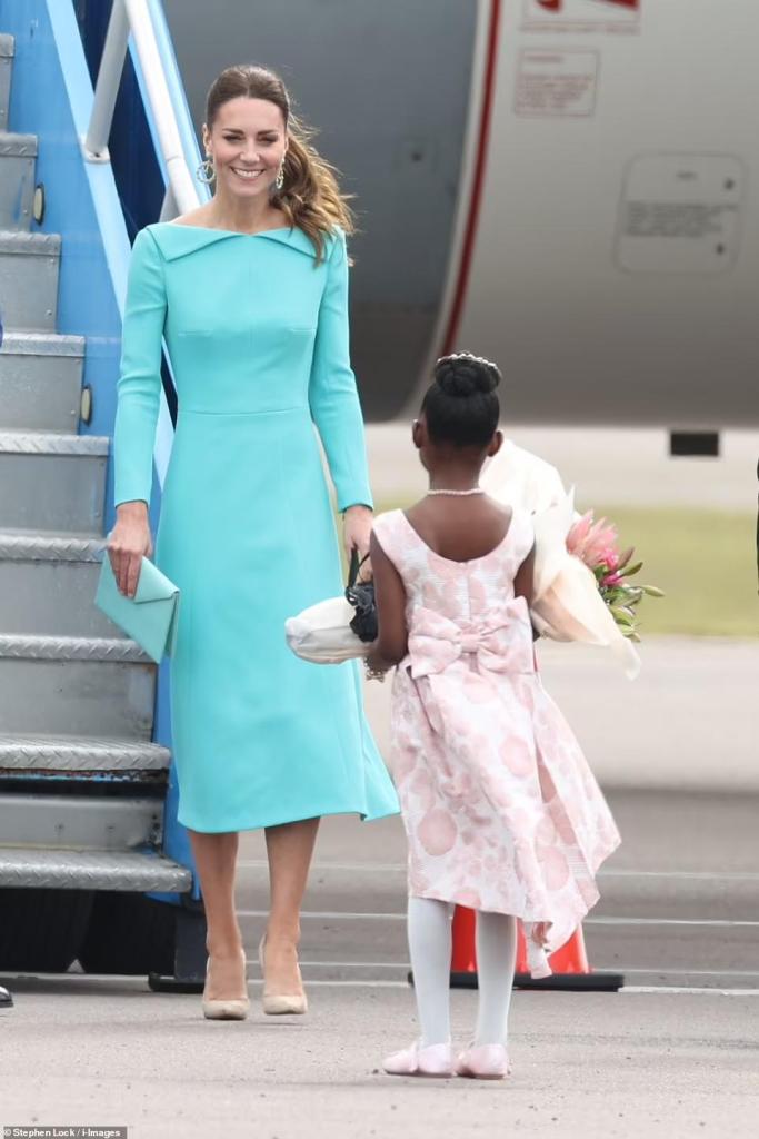 By far, one of my favourite outfits worn by Catherine, HRH Duchess of Cambridge. As I have family from posh Bahamian society, this dress is the true beau idéal. Wool crepe, it is a heavier fabric, which is just right for the Bahamas, which are farther north in the Caribbean which at this time of year is cooler rather than not. Furthermore, with 700 plus islands, there are no mountains in the Bahamas, so there is always a breeze, at times brisk, and of course at this time of year, cooler rather than tropical. For that reason, this heavy almost quilted-looking wool crepe, for being lined, is positively the proper choice. Catherine would not be reminded of England for being braced against the cool breezes of the Bahamas on arrival.