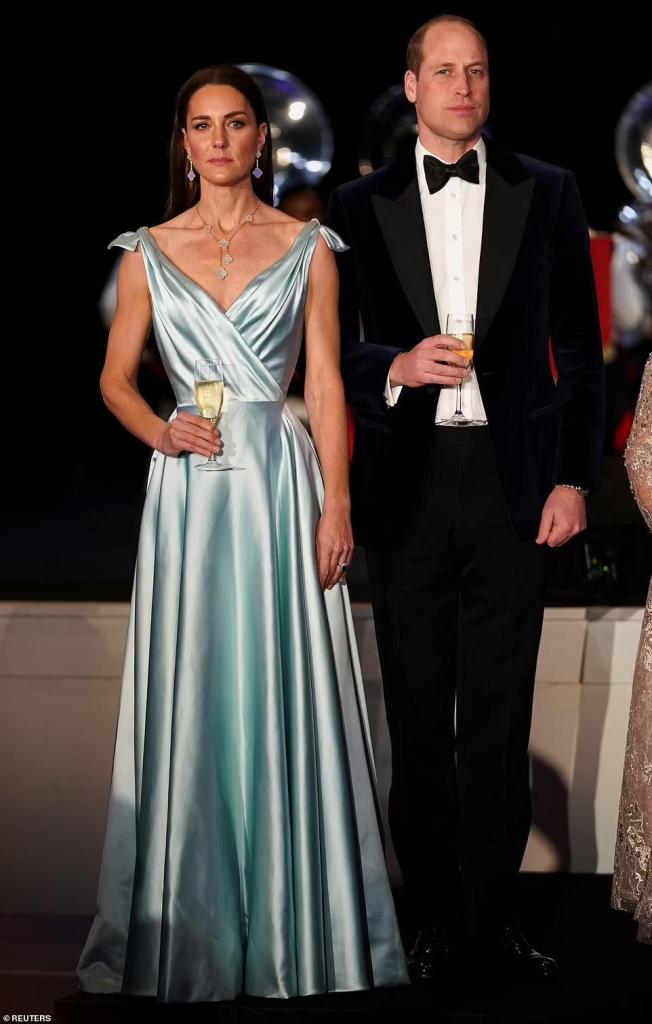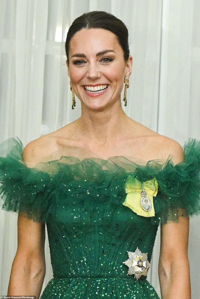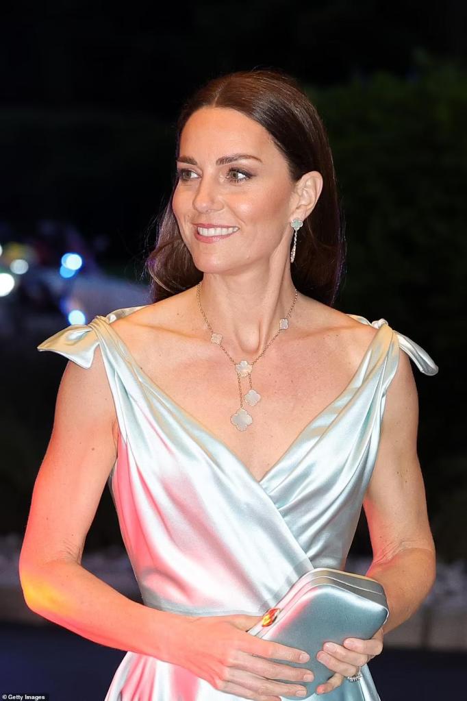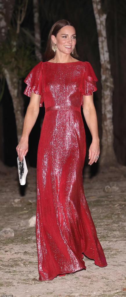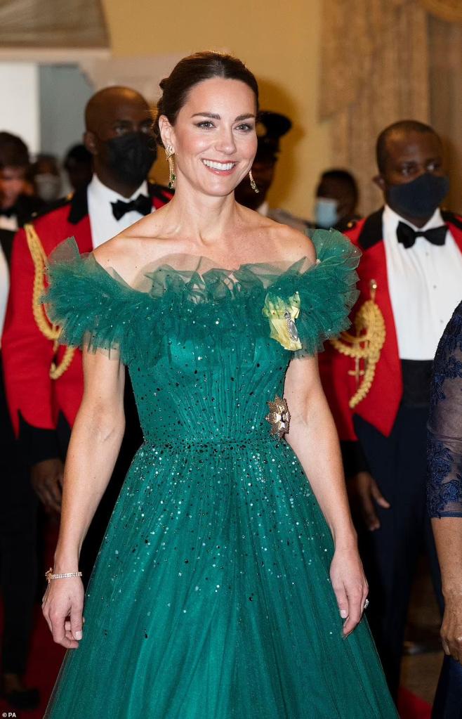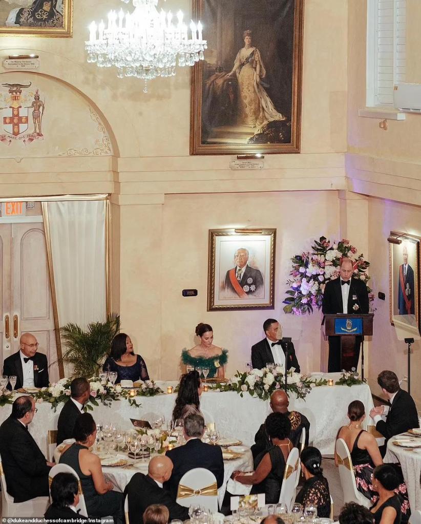 Another state dinner and Catherine, HRH Duchess of Cambridge elegantly swans through the evening in a Phillipa Lepley gown with bows at the shoulder, matching clutch with William in smoking whilst in the Bahamas.